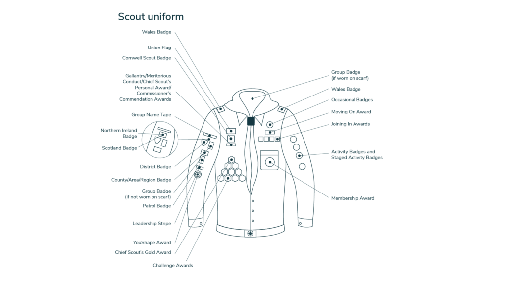 Scouts take part in many activities at troop meetings that work towards badges. Scouts can also earn badges in their own time. A list of all the current Scout badges can be found here. There are also challenge award badges and details about these can be found here. When a Scout is awarded a badge, it is needs sewing onto the uniform in the positions outlined below.