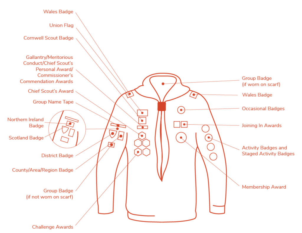 Squirrels take part in activities at their meetings that work towards badges. A list of all the current badges can be found here. There are also challenge award badges and details about these can be found here. When a Squirrel is awarded a badge, it is needs sewing onto the uniform in the positions outlined below.